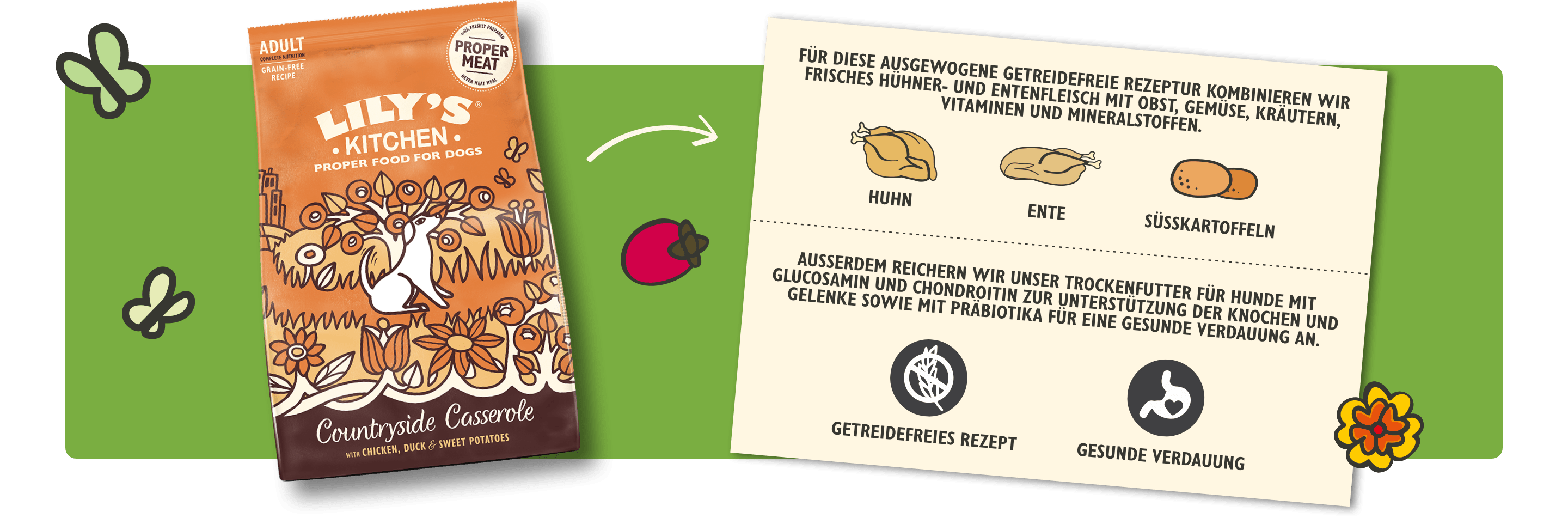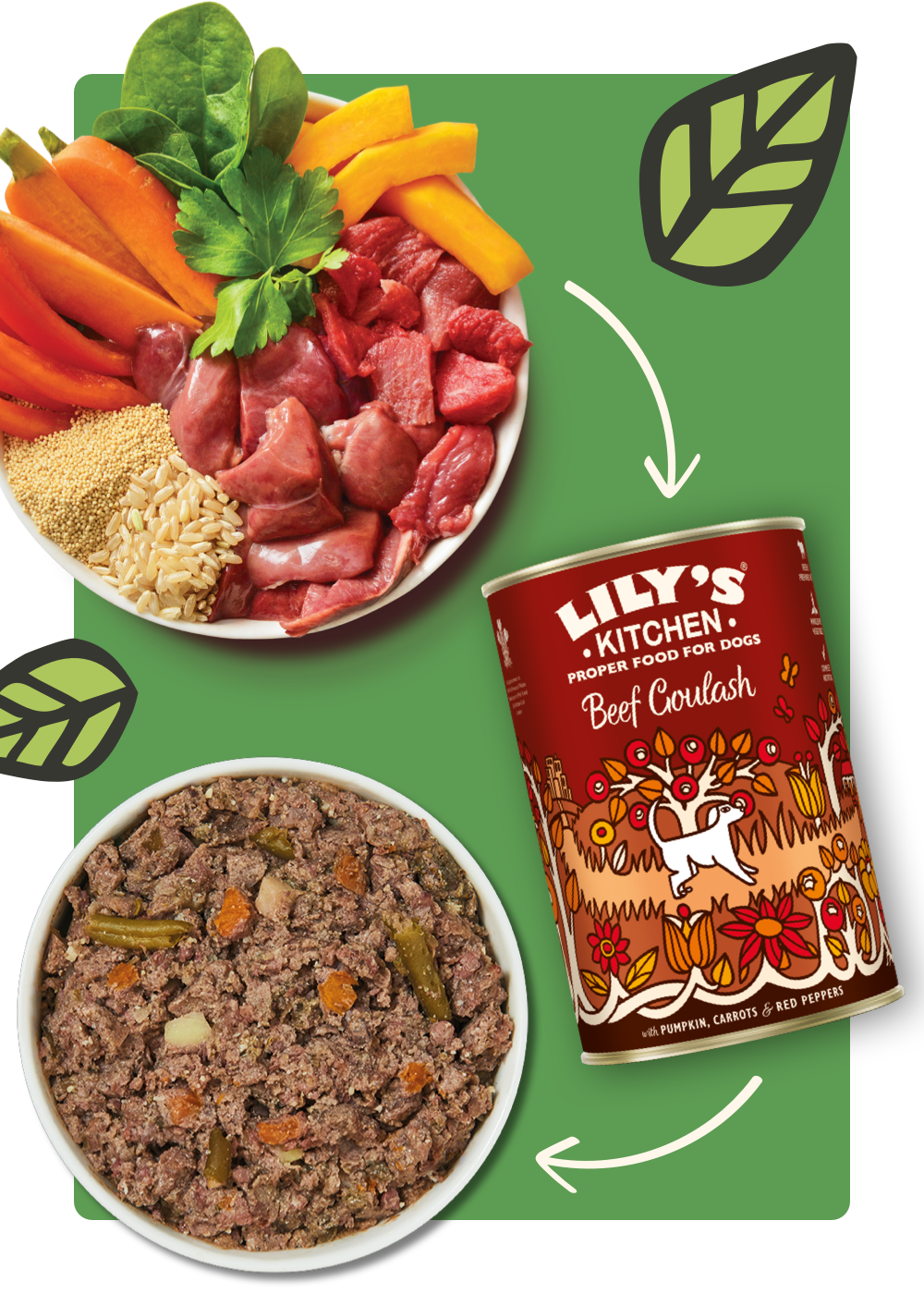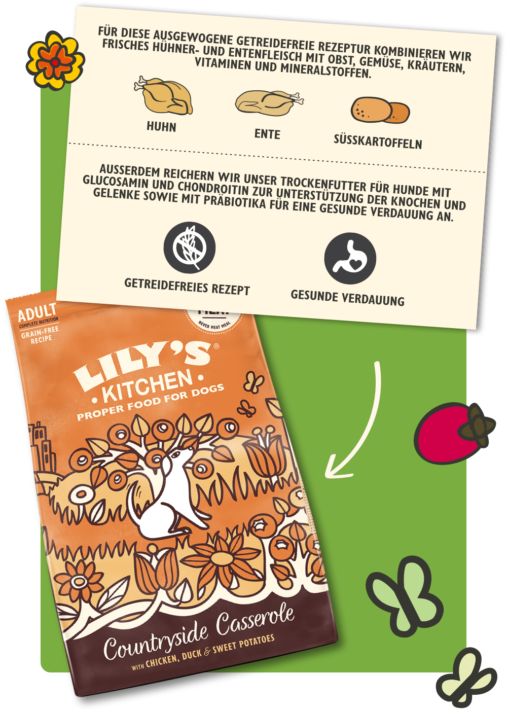Unsere Rezepturen sind ausgewogen – mit Zutaten wie Fleisch, Innereien und Fisch, die frisch zubereitet sind und Proteine sowie Vitamine bieten, welche den Haustieren helfen, gesund zu bleiben. Ein weiterer Grund, warum wir gerne Fleisch und Innereien verwenden: Es ist einfach lecker. Das werdet ihr an den Reaktionen eurer Katzen und Hunde sehen, wenn Lily's Kitchen in den Napf kommt. Und da es bei richtig gutem Tierfutter genau darum geht, werdet ihr in unseren Rezepturen niemals Fleischmehl finden.